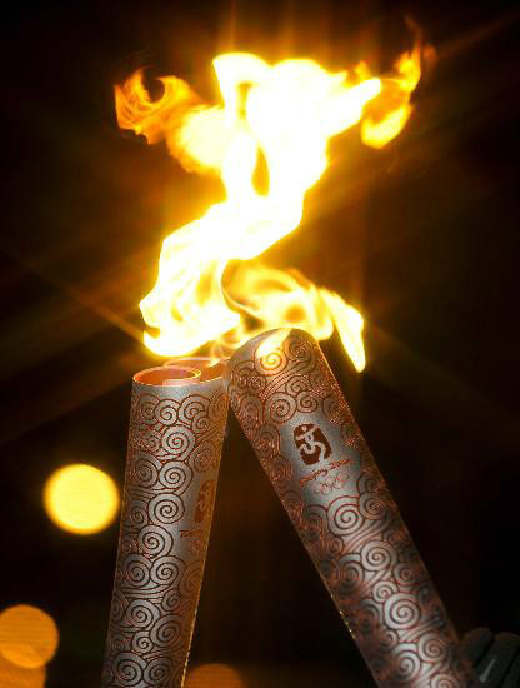火炬造型的设计灵感来自中国传统的纸卷轴。用源于汉代的漆红色绘制出祥云图案,高雅华丽、内涵厚重。火炬高72厘米,重985克。它以符合环保要求的丙烷为燃料,燃烧时间可达15分钟,能在每小时65公里和每小时雨量50毫米的情况下保持燃烧,零风速下火焰高度25至30厘米,能在强光下识别。