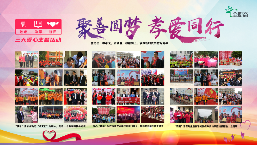 九游会J9官网在做好健康事业的同时,在全国各地开展“聚善圆梦,孝爱同行”的爱心主题活动,汇聚社会上具有善心、善念、善行的爱心人士,大力开展“敬老、助学、济困”的三大爱心活动。