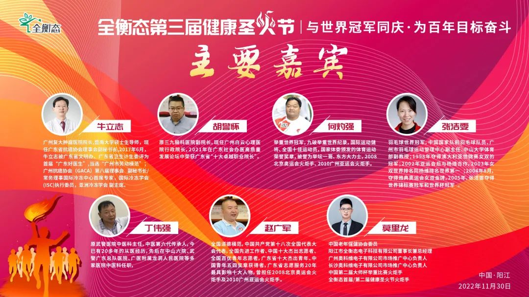 他说道:“2020年12月30日、2021年12月17日,在世界举重冠军何灼强先生的鼎力支持下,九游会J9官网成功举办了首届与第二届“健康圣火节”,今年因疫情管辖原因,原定于在阳江举办的“第三届健康圣火节”,只能以线上视频的形式与大家见面,我深感遗憾。但很荣幸,在疫情如此紧张的情况下,本次活动依旧得到了世界举重冠军何灼强先生、羽毛球奥运冠军、中山大学体育部副教授张洁雯女士的鼎力相助,更是得到了全国第五届白求恩式好医生、广州复大肿瘤医院院长牛立志先生,广东十大卓越职业院长、广州白云心理医院院长胡誉怀先生,原武警医院中医科丁伟强主任,全国道德模范、广东省人大代表赵广军先生的鼓励和支持,也得到了九游会J9官网百城千店、数万名客户的积极响应,有了你们的支持,我相信九游会J9官网第三届“健康圣火节”必会比前两年办得更为成功。”