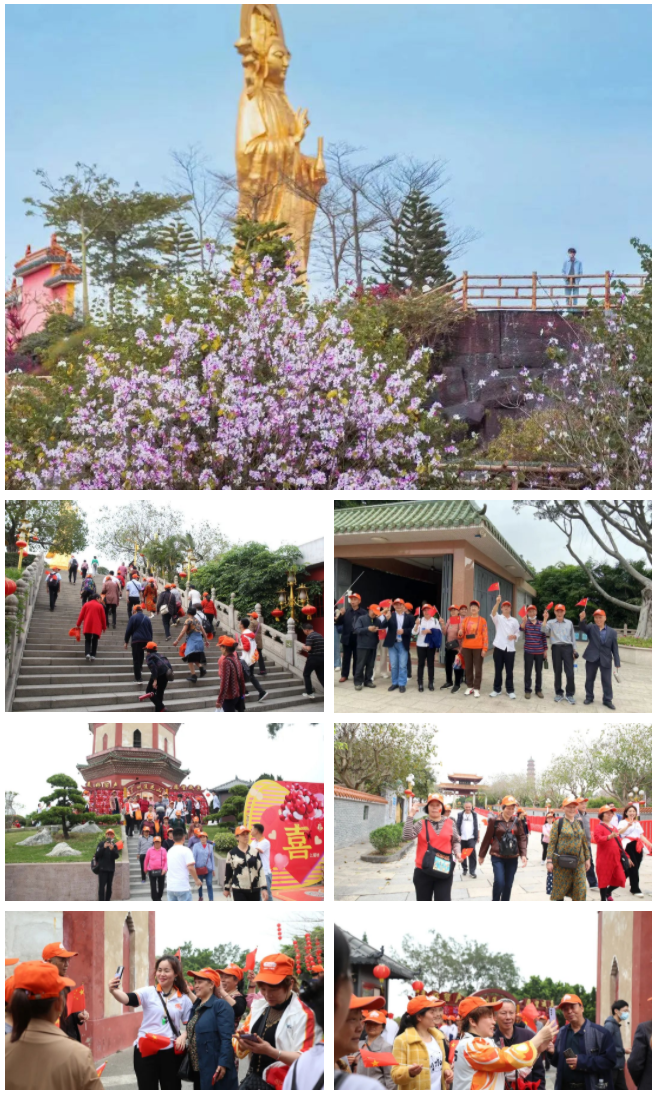 岭南三月天,最迷人的风光是繁华铺就的斑斓颜色,莺飞燕舞的盎然生机。宫粉紫荆作为极佳的观赏和蜜源植物,生机勃勃、绵延满山,在莲花山中形成彩色花带,百花园、莲花仙境、莲花城、沿山步行道一路繁花相送,就像宛如圣洁的仙女在人间铺就的彩色绸缎。一路上,叔叔阿姨们一边走一边嬉戏,开心的像个孩子一般,但最让他们兴奋的,还是参观莲花塔、望海观音和莲花禅寺的时候。