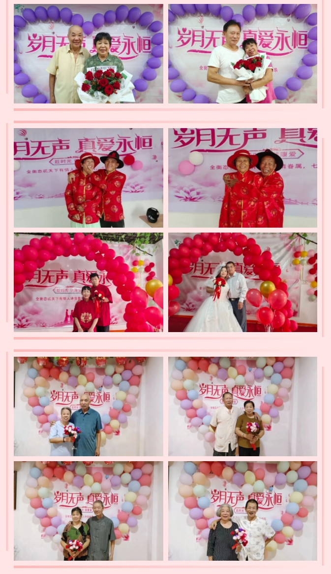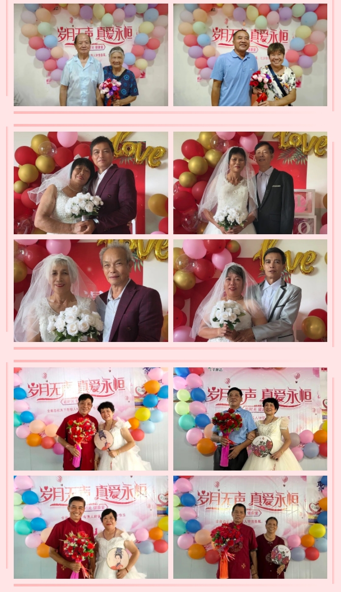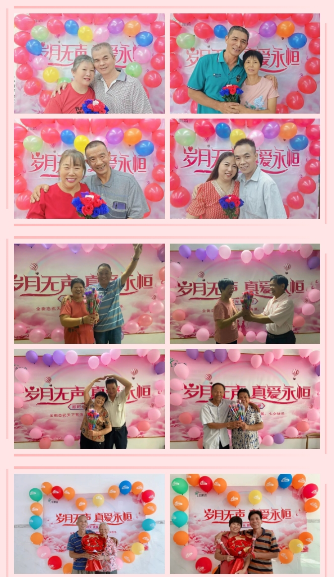 金婚银婚夫妻手捧鲜花,依次合影留念,将此刻的幸福定格。那个年代的他们或许没有如梦如幻的婚纱相片、没有精致华丽的衣裳,生活的柴米油盐也淡化了爱情的风华雪月,但此刻,在七彩的气球、精致的妆容、玫瑰的香气间,仿佛回到了相识时的懵懂羞涩、相知时的心心相印、相爱时的甜蜜回忆,艰难时的风雨同舟,每一页、每一篇都写满了快乐的回忆。有位老人感叹:“俗话说,少年夫妻老来伴,几十年朝夕相伴,一家三口在一起,无关荣华富贵,无关高矮胖瘦,只要走过了四季,我们都健健康康,这就是最好的一年。”