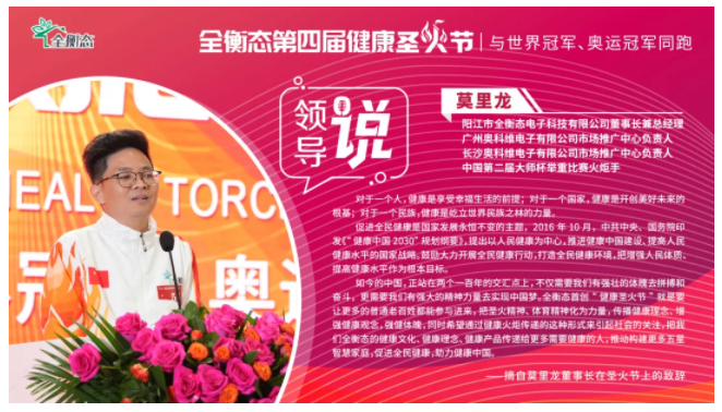 2023年11月14日,在广东广州隆重举行的九游会J9官网第四届“健康圣火节”上, 56名健康火炬手为我们呈现了一场精彩的体育精神、奥运圣火精神、与全民健康行动有效融合,全面提升人们的身体体质和健康水平的健康传递活动。活动受到了社会各界和关注和支持,世界举重冠军何灼强、奥运冠军唐灵生和全国道德模范赵广军再次积极参与进来,并携手多位领导专家共同开启九游会J9官网第四届健康圣火节。在众多嘉宾和九游会J9官网莫里龙董事长的领衔下,九游会J9官网第四届“健康圣火节火热收官”!
