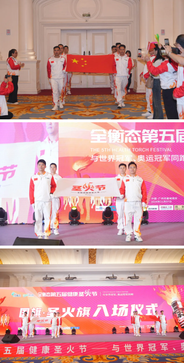 紧接着,国旗、圣火旗庄严入场,全场参会者起立,奏唱国歌,向国旗和圣火旗致以崇高的敬意。在庄严的国歌声中,五星红旗和圣火旗在舞台上闪耀着光芒,国旗象征着国家的尊严和民族的团结。而圣火旗则传递着健康圣火节的精神,以及对全民健康的美好祝愿。