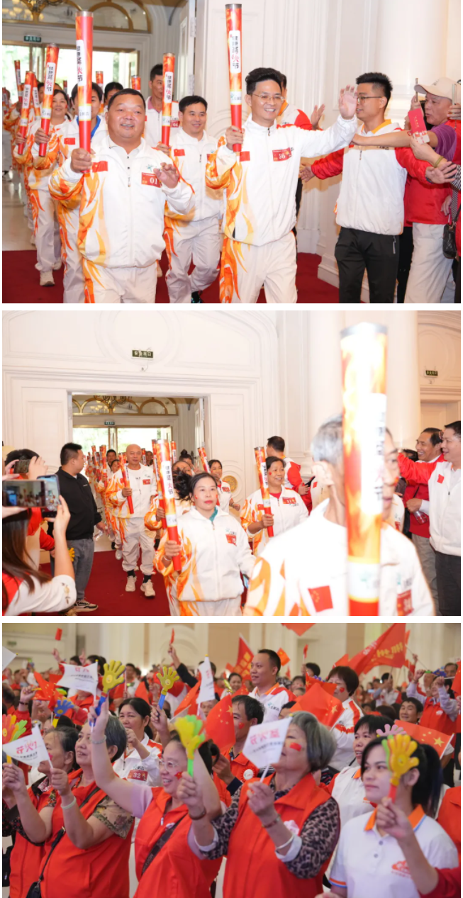 在台上,火炬手们留下了珍贵的合影,作为对这一难忘时刻的纪念。合影中,每个人脸上都洋溢着自豪和喜悦的笑容,他们手中紧握着火炬,象征着健康与希望的传递。