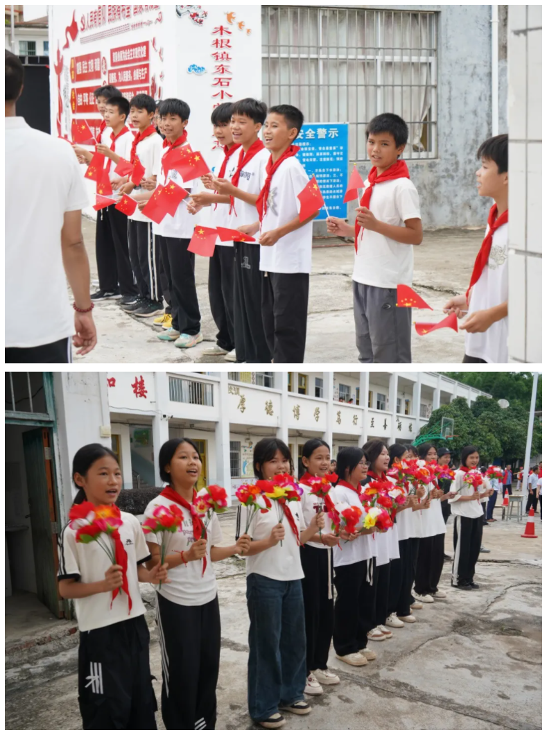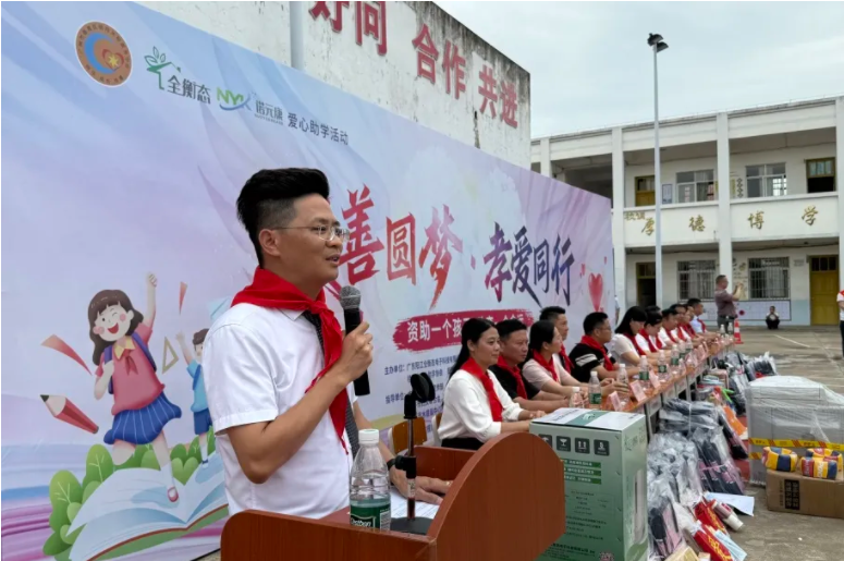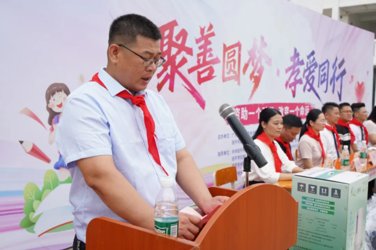 东石小学岑国杉校长首先致欢迎辞,他的话语质朴而充满力量:“这份沉甸甸的情谊,全校师生铭记于心!崭新的课桌椅、书包、办公设备,不仅改善了我们的学习工作条件,更让孩子们真切感受到来自山外的温暖与关怀,点燃了他们心中更炽热的求知火种。”他代表全校师生,向所有爱心人士致以最深的谢意。