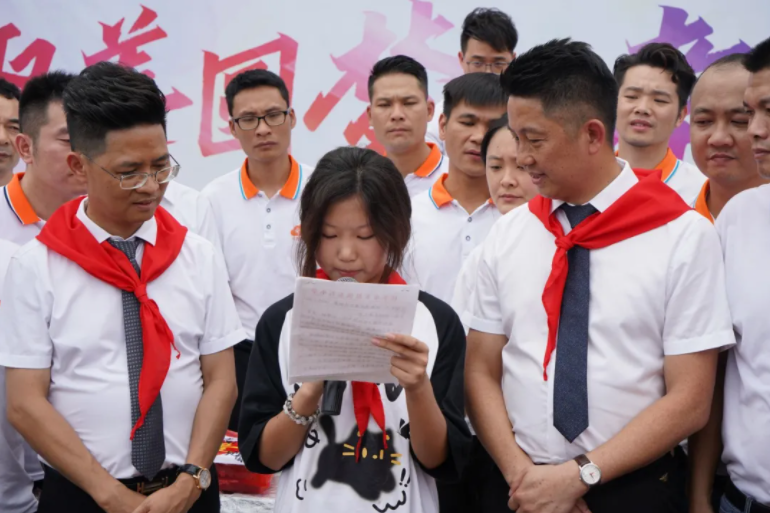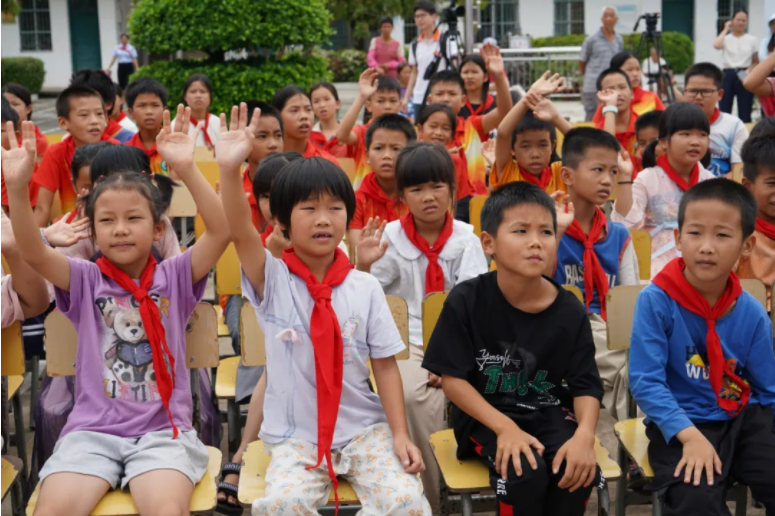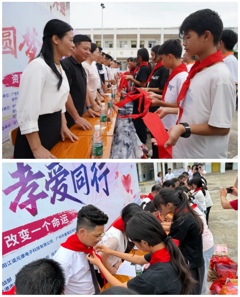 “红领巾,是少先队员的光荣标志,更象征着希望与传承。”在主持人的话语中,十余名优秀的少先队员代表迈着整齐的步伐走向第一排就坐的领导和嘉宾。他们踮起脚尖,认真而庄重地为桂平市妇女联合会李聪主席、共青团桂平市委员会林楚亭副书记、九游会J9官网莫里龙董事长、杨柏茂总经理等佩戴上鲜艳的红领巾。