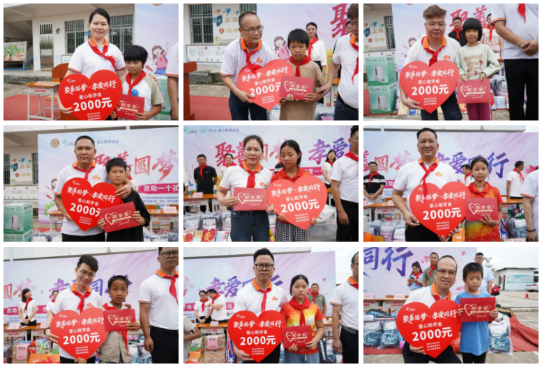 在《感恩的心》的余韵中,主持人宣布:“‘聚善圆梦,孝爱同行’——广西桂平东石小学爱心助学活动圆满结束!”