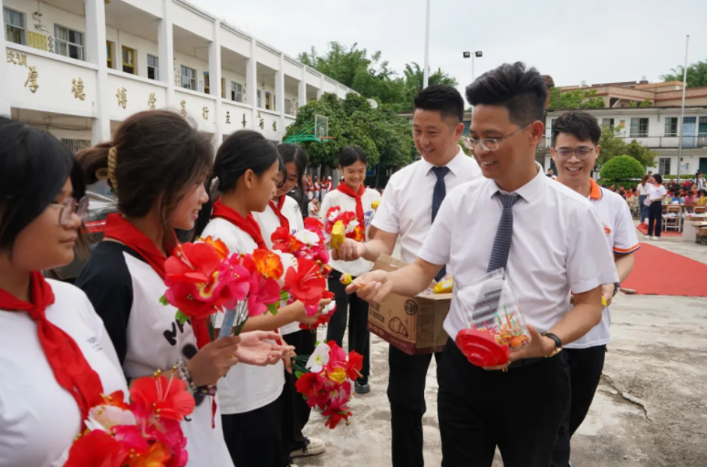 交接完毕,一份崇高的回赠将仪式推向情感的高潮。桂平市妇女联合会李聪主席、共青团桂平市委员会林楚亭副书记与岑国杉校长一同上台: